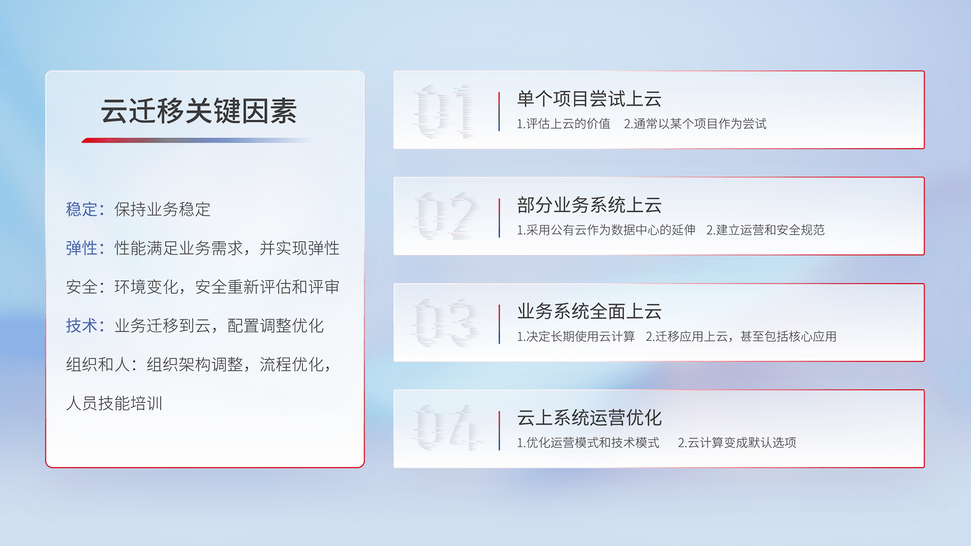 结合实际业务,,,,从规划设计、、云平台选型、、、云原生改造、、、数据迁移、、集成交付,,,,迁移全过程为客户识别最佳上云路径,,,做好风险识别管理,,,,设计网络架构、、、、身份权限、、安全审计合规、、、、操作审计、、、日志审计、、监控告警策略、、多站点容灾设计等,,对云上基础设施进行整体规划,,提升IT治理水平,,,,以满足弹性、、、高可用、、、高性能的需求。。